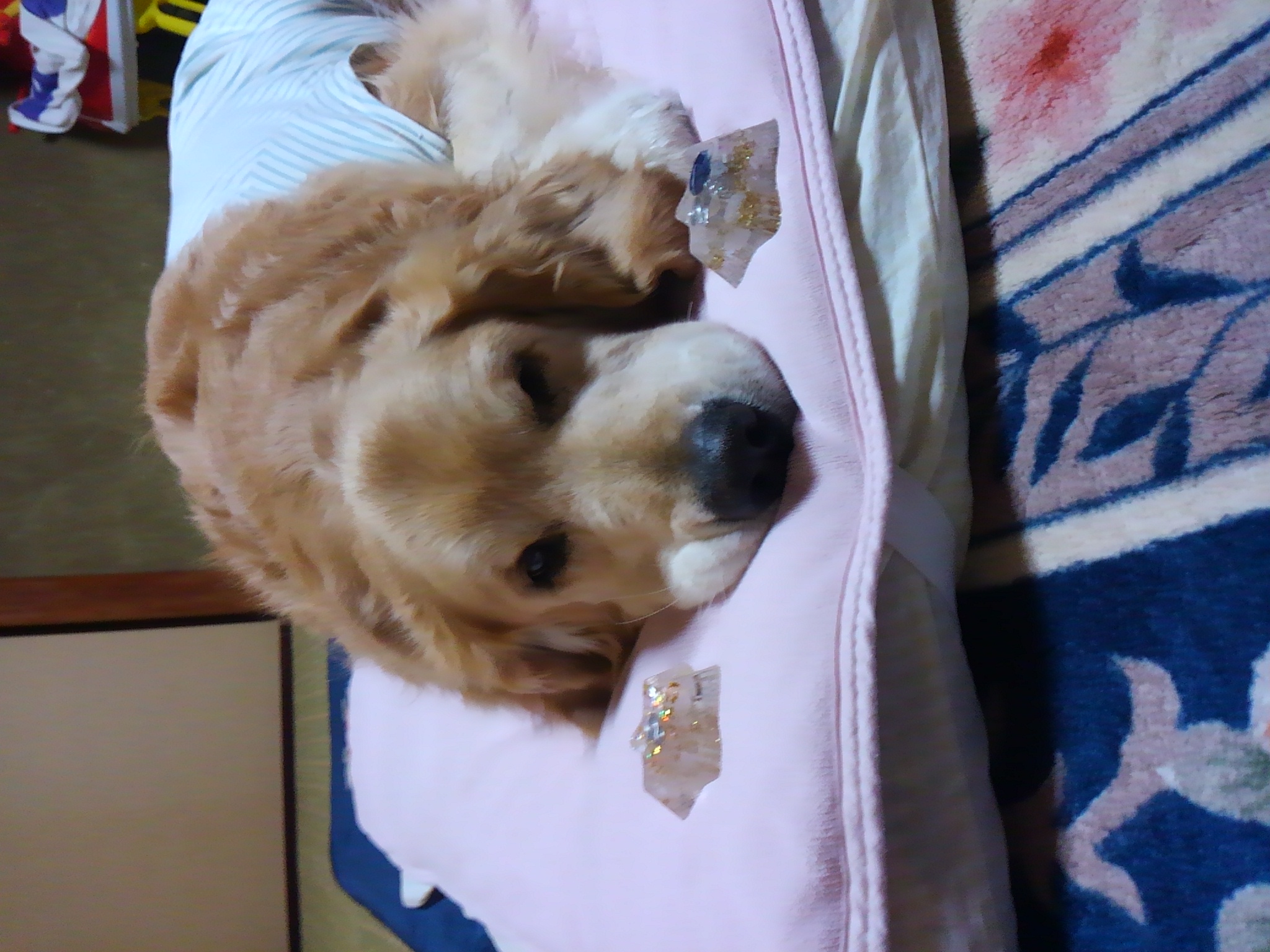 昨夜は愛犬の側にオルゴナイトを置いて